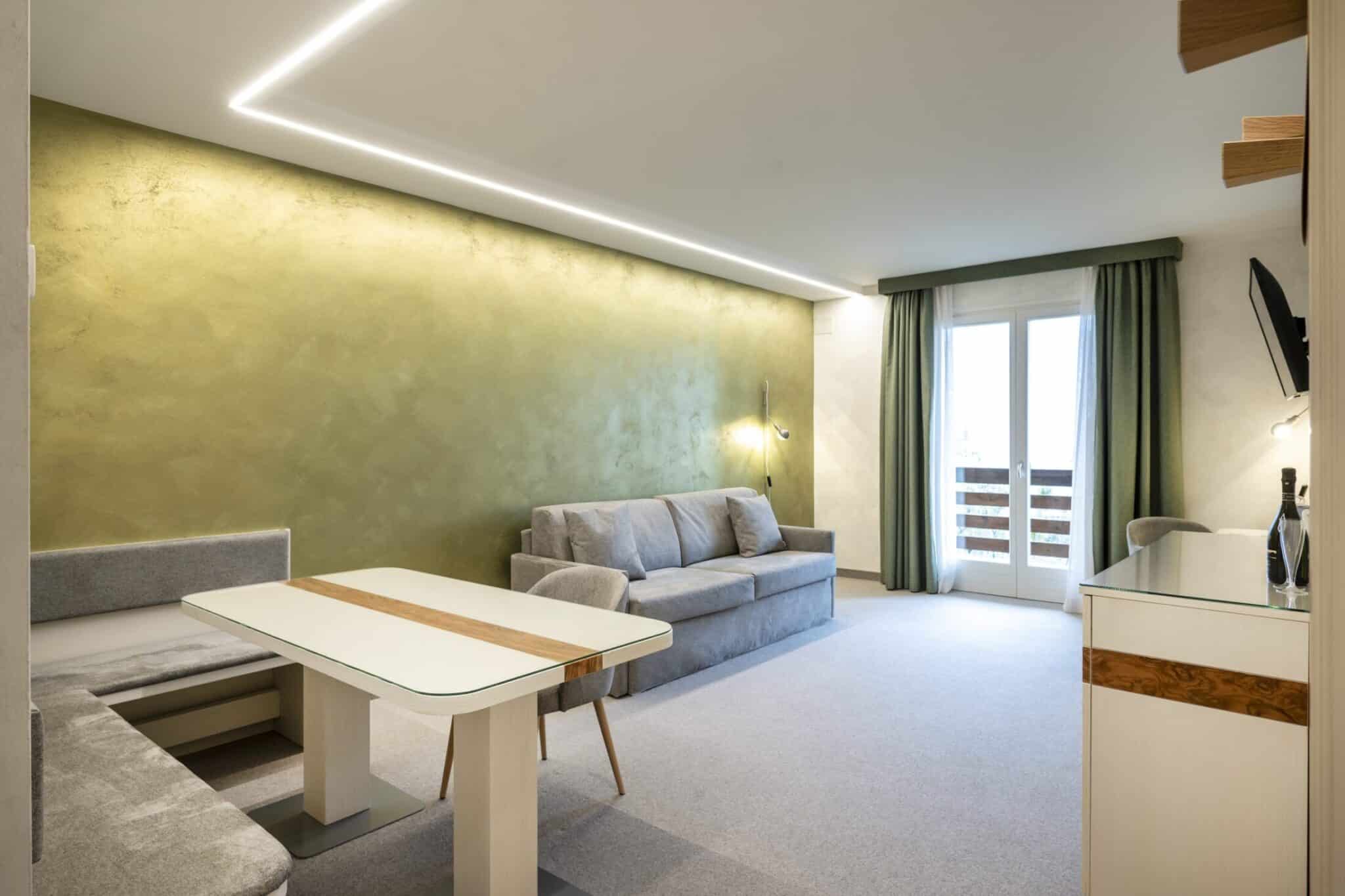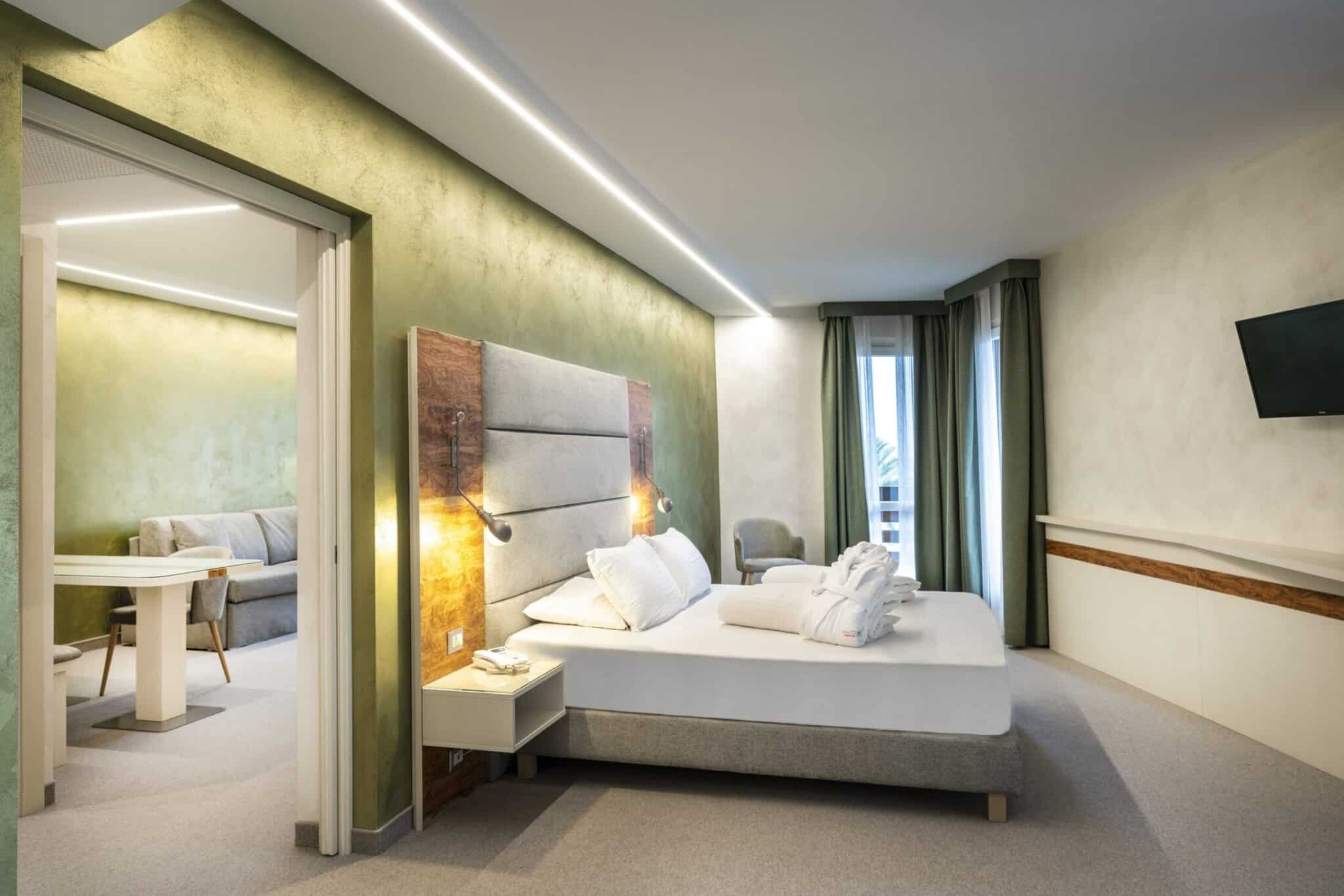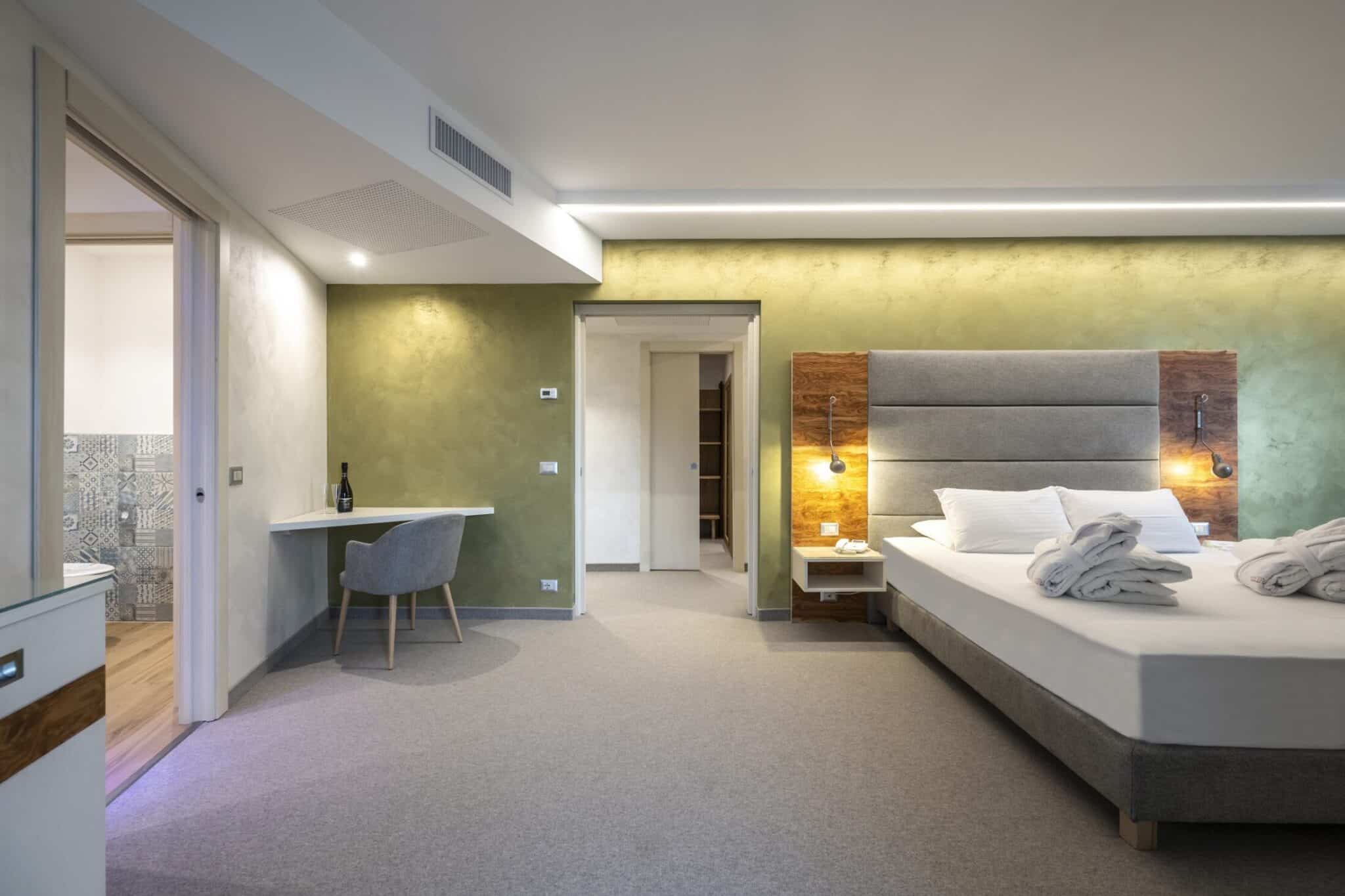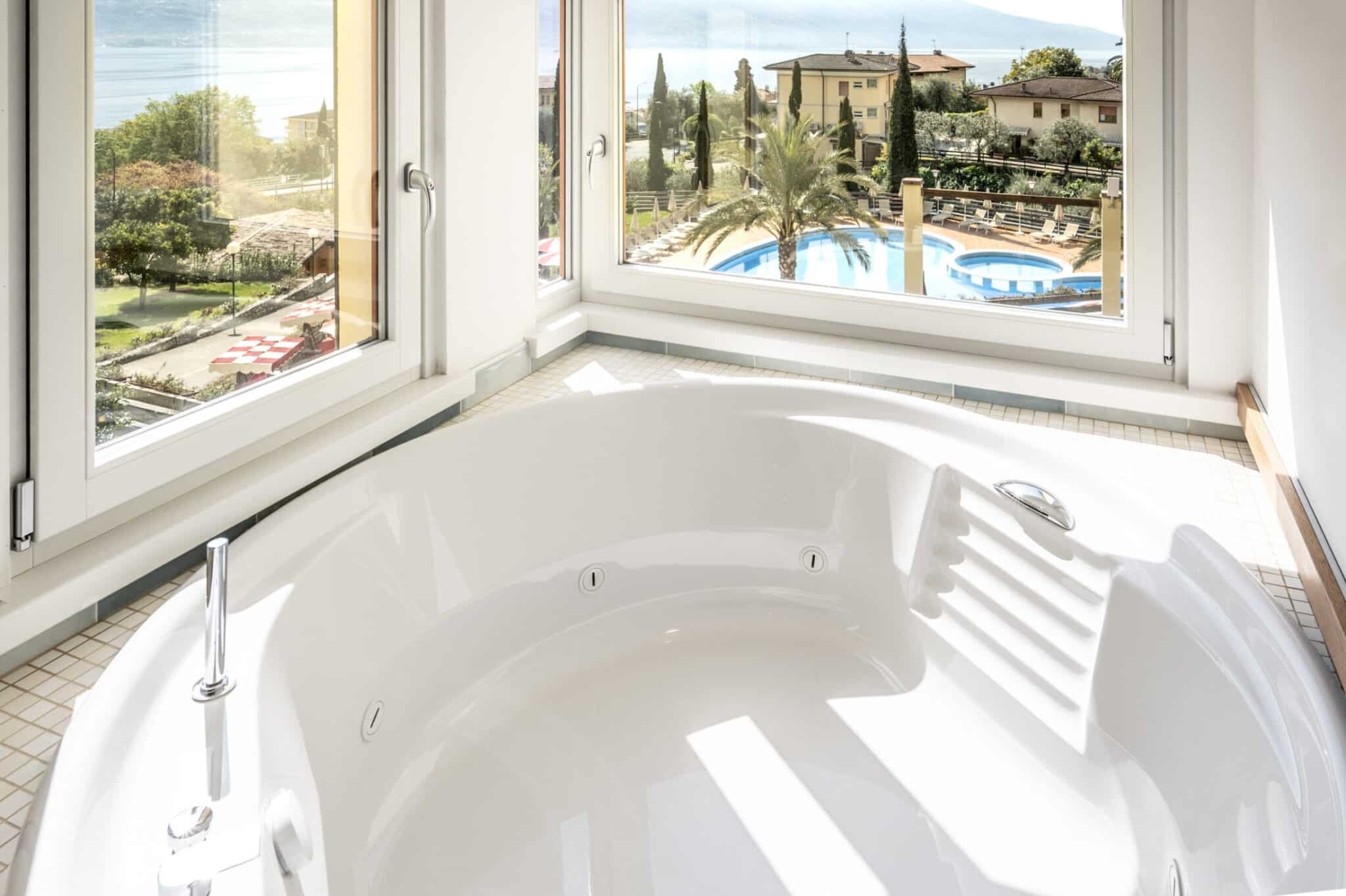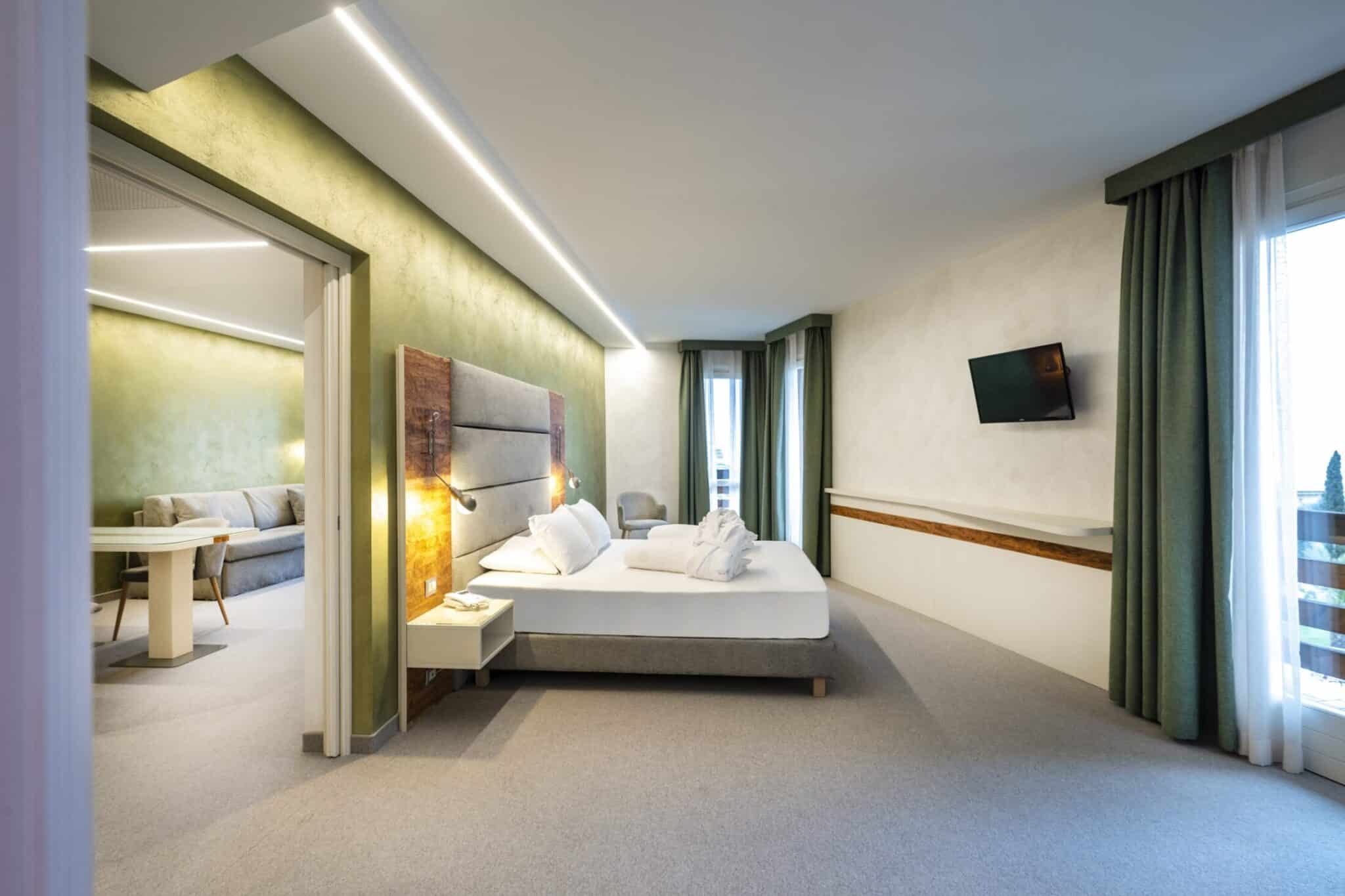 Die Räume sind klar getrennt und einladend: ein heller und luftiger Wohnbereich, ein entspannender Schlafbereich, ein privater Balkon, von dem aus man sich von der Landschaft verzaubern lassen kann, sowie eine Panoramawanne mit Whirlpool, in der man sich beim Blick auf den Horizont dem Wohlbefinden hingeben kann.